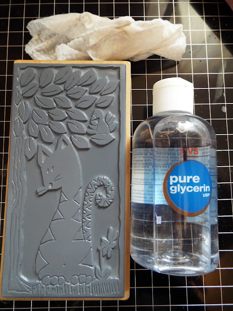 Next a coat of glycerin - a $4.00 drugstore item - you can also re-ink your embossing/resist pad with this! Let it sit over night and then wipe with a damp towel. Your stamp should have that nice soft rubber texture. Now the ink will sit on the rubber!